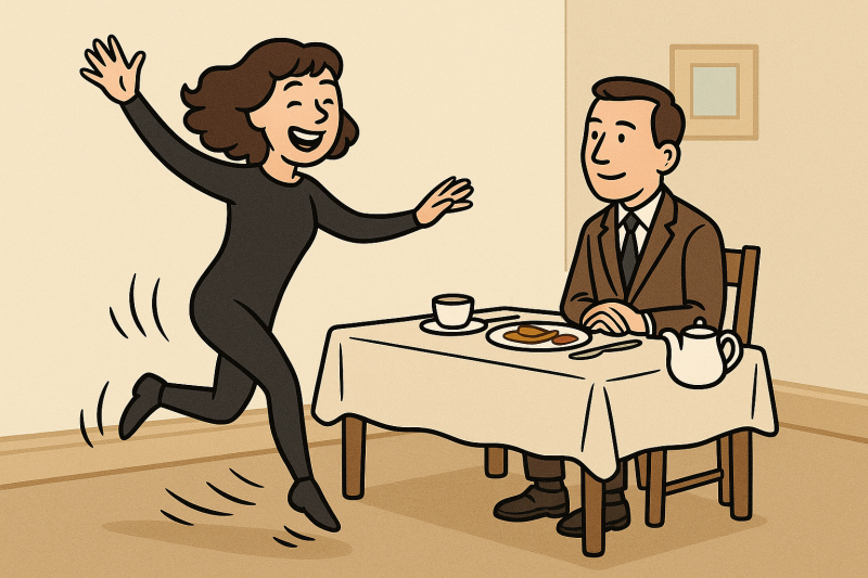 The next minute I heard banging, clumping and muffled voices. I peeked around the corner, and there was Debbie doing a tap dance for him! Properly keeping him amused. Well, it amused me — and still does to this day.
