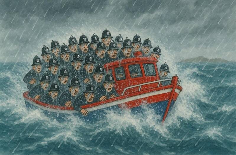 At the allotted time, about forty souls—policemen and a few spouses—ventured down to the quay, boarded the Swordfish, and off we went. The first five minutes of the trip were comparatively calm, as we were sheltered by St Mary’s. But as soon as we passed Carn Morval, it was a different story.