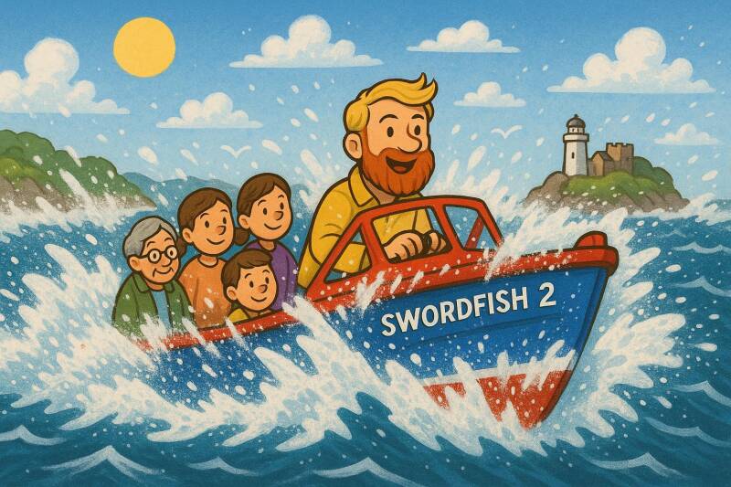 Eventually, fed and watered, they returned to the Swordfish for the trip back home, the wind had dropped a little and with the weather now slightly abated we ran “downhill.” The return was much calmer — no waves, no splashing.