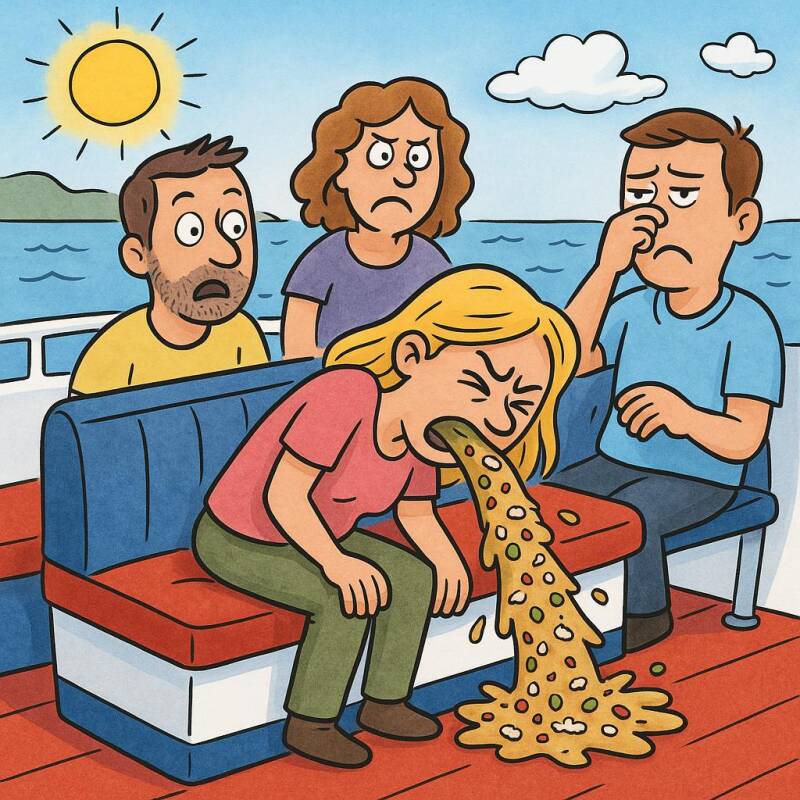 The sea was rather choppy and Ethel wasn’t feeling too bright when suddenly her breakfast made an appearance and shot over the side of the boat.